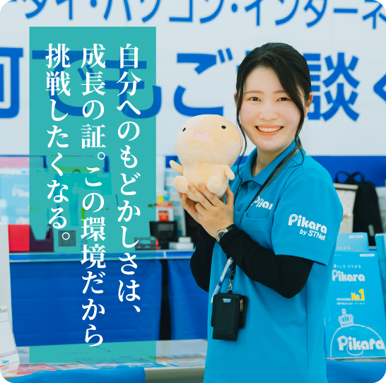 これまでは自分の店舗のことだけを考えていましたが、サブリーダーになってから視野が広がりました。他店舗を含めた全体の目標達成や、スタッフが契約しやすいと感じてもらえる体制づくりを意識しています。役割が変わったことで、自分の足らないところが見えてくるようになりました。自分へのもどかしさはありますが、成長のチャンスだと前向きにとらえ、これから挑戦・失敗を繰り返していこうと思います。こう考えられるのは、挑戦を応援するCoaマネジメントの社風のおかげですね。
